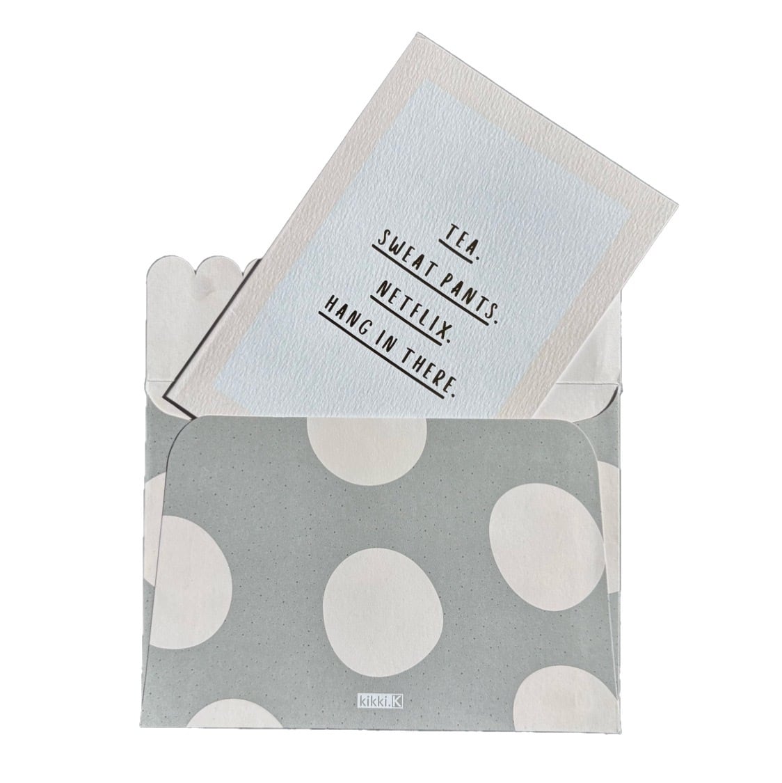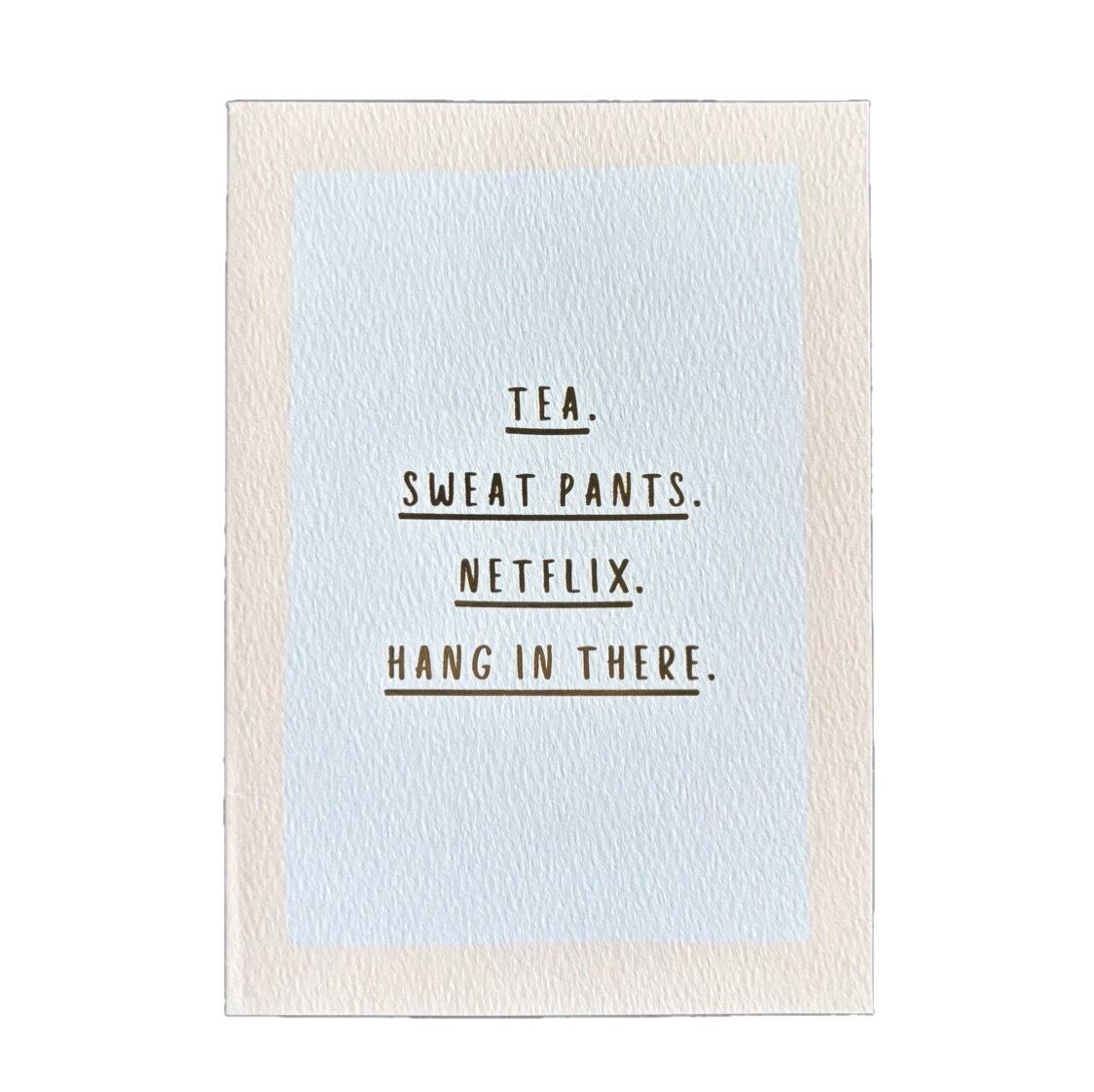 "TEA. SWEAT PANTS. NETFLIX. HANG IN THERE"